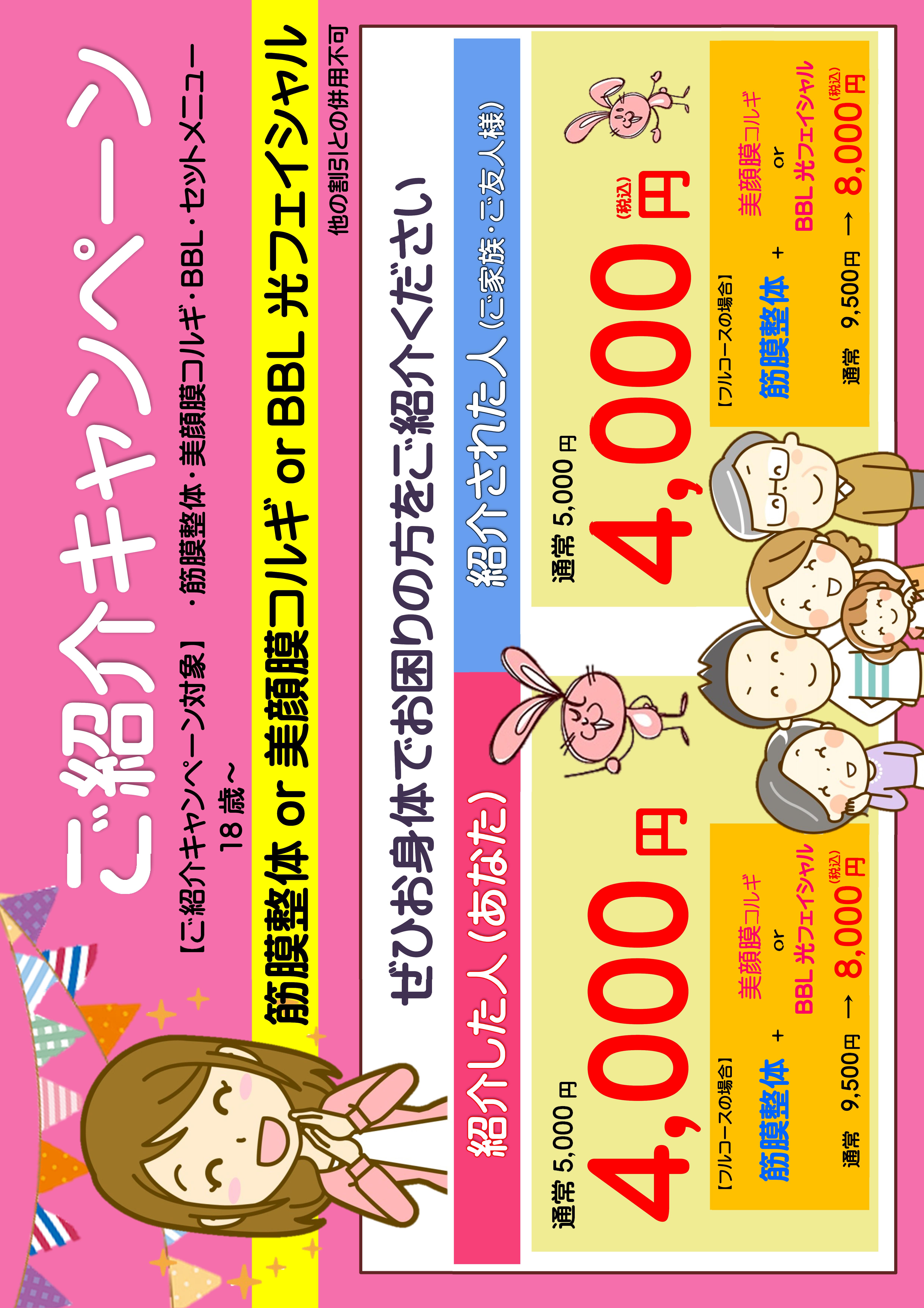 【ご紹介キャンペーン】18歳~ 筋膜整体・美顔膜コルギ・BBL・セットメニューをご紹介下さったお客様対象